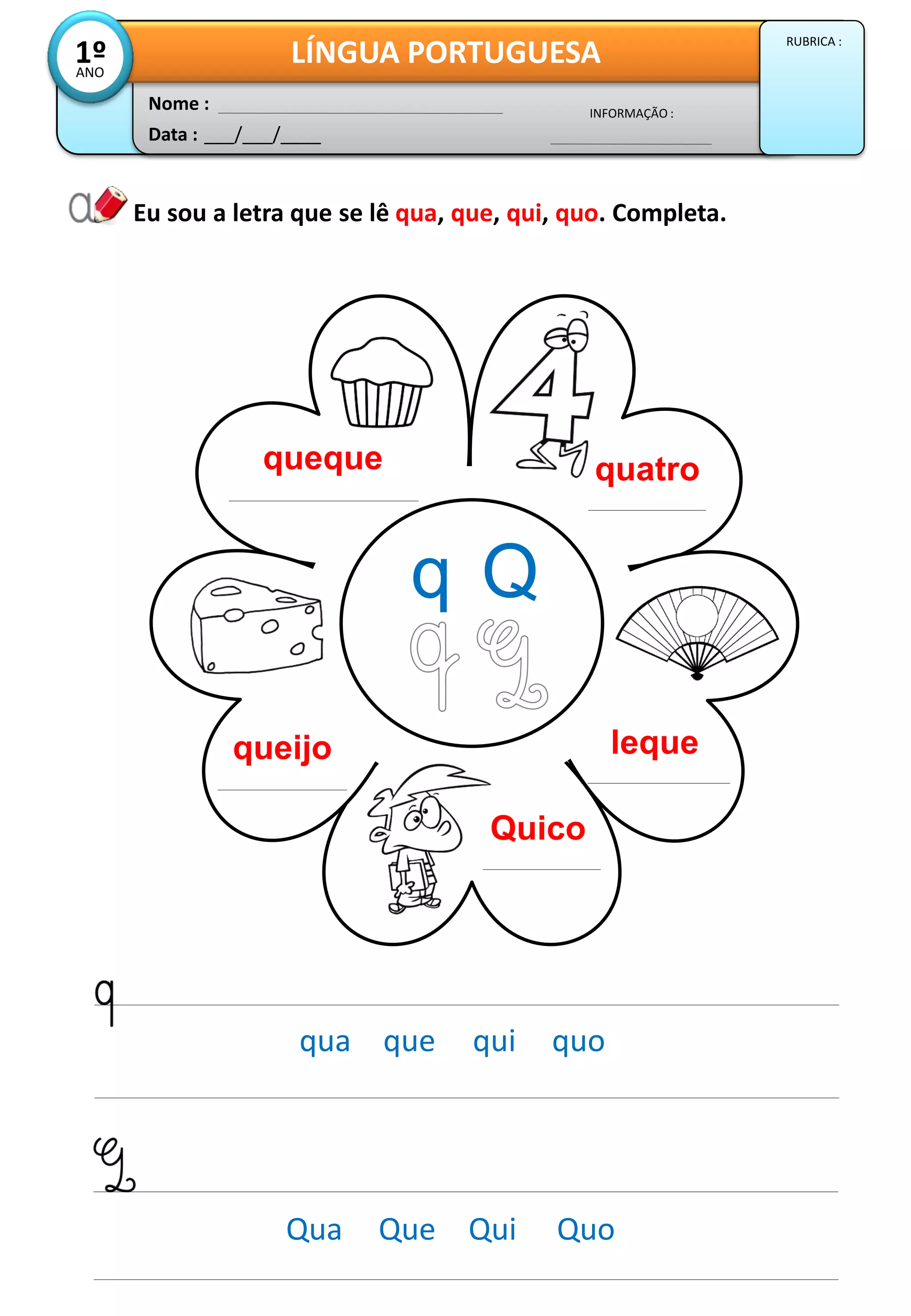 Este documento apresenta várias atividades relacionadas com a letra "q" em português. As atividades incluem escrever palavras começadas por "q", separar sílabas, formar frases com imagens e completar exercícios de ortografia. O objetivo é ensinar estudantes do 1o ano sobre a pronúncia e uso da letra "q" em palavras portuguesas.