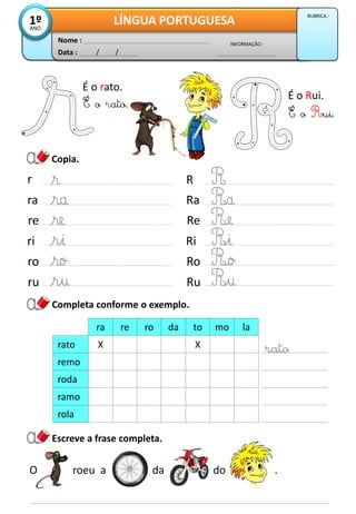 Este documento contém uma série de exercícios de português para alunos do 1o ano focados na letra R. Os exercícios incluem formar palavras com sílabas começadas por R, completar frases com estas palavras, escrever frases com estas palavras e identificar imagens correspondentes a estas palavras. O objetivo é ensinar os alunos sobre palavras que começam com a letra R e melhorar suas habilidades de leitura e escrita.