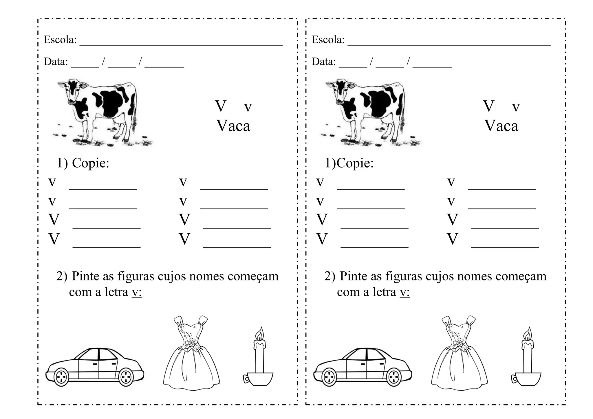 O documento é um exercício escolar para crianças que inclui instruções para copiar e pintar figuras de animais cujos nomes começam com a letra V, como vaca. As crianças devem copiar e pintar figuras de vacas nos espaços fornecidos.