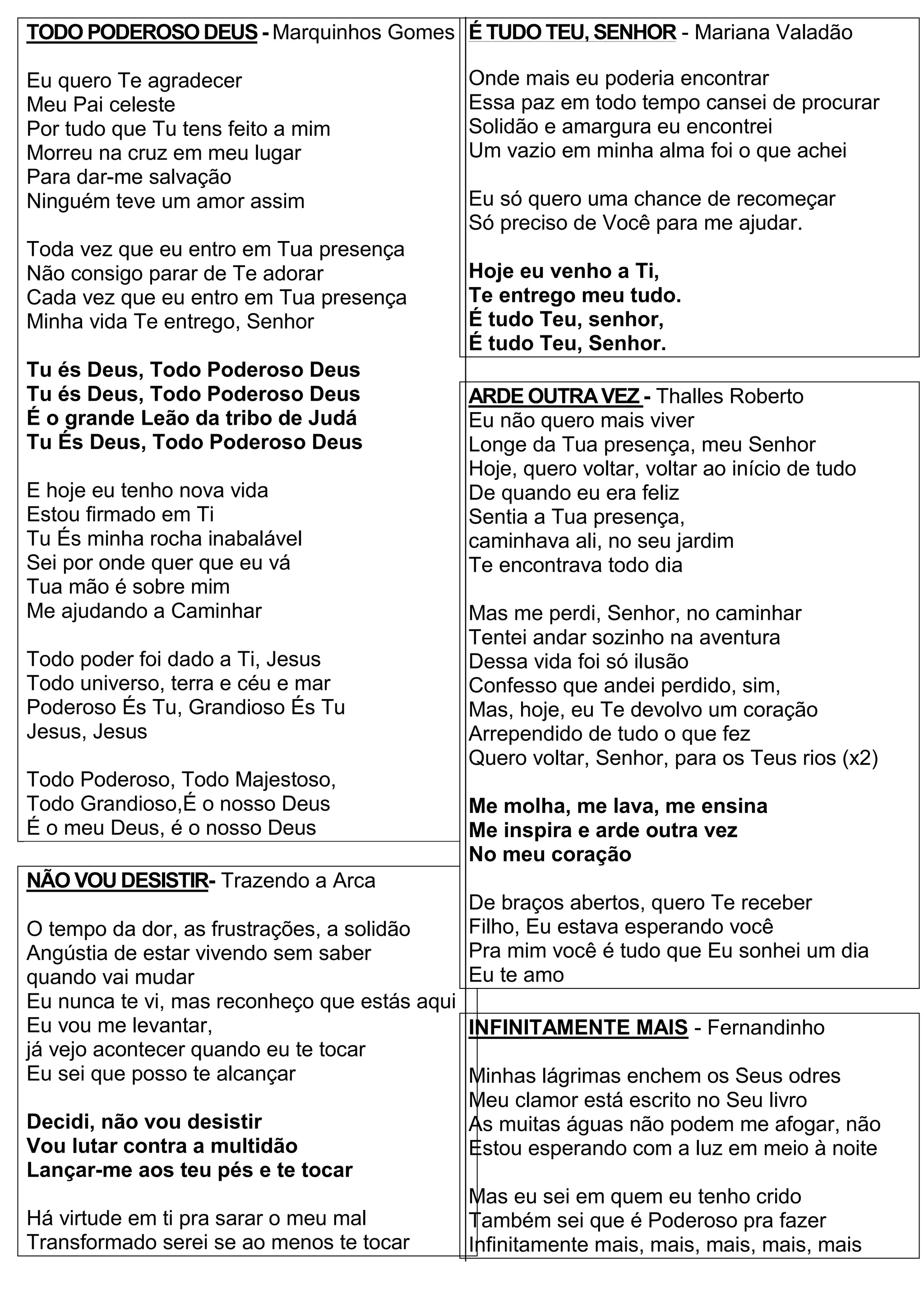 1) O documento é uma compilação de letras de músicas cristãs que louvam a Deus e expressam fé e dependência.