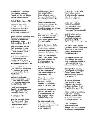 1) O documento apresenta uma coleção de haicais e trovas sobre temas como a natureza, o amor, a saudade e a vida cotidiana. 2) Inclui também poemas sobre temas sociais como a fome e a justiça social. 3) Finaliza com um poema sobre uma ave atingida por um raio durante o voo.