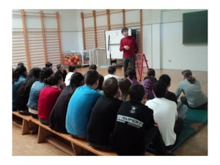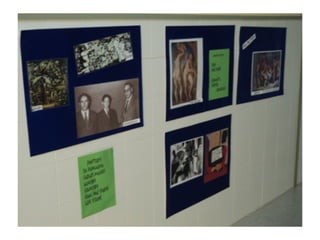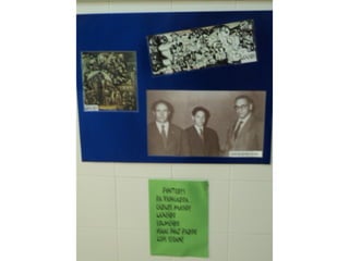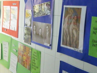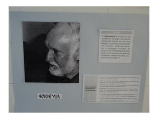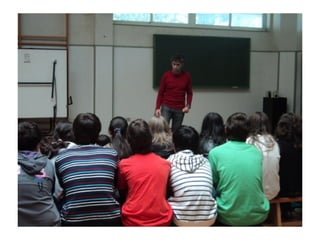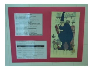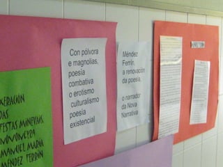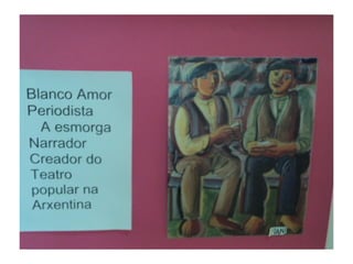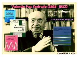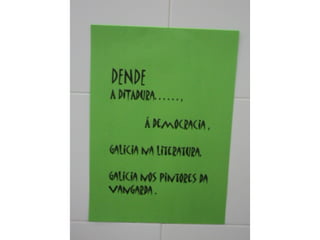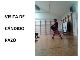 O documento anuncia a visita de Cándido Pazós para uma exposição que inclui caricaturas, haikus e marcapáginas com o tema "Quando chegares pelo mar". A visita ocorrerá em 17 de maio de 2012 no IES Enrique Muruais.