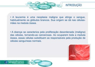 A leucemia é uma doença maligna que afeta a medula óssea, impedindo a produção de células sanguíneas normais e causando o aumento de células imaturas no sangue. Os sintomas incluem fadiga, palidez, infecções frequentes e sangramentos. O diagnóstico é feito por exames de sangue e medula óssea e o tratamento depende do tipo de leucemia, variando entre quimioterapia e medicamentos orais.