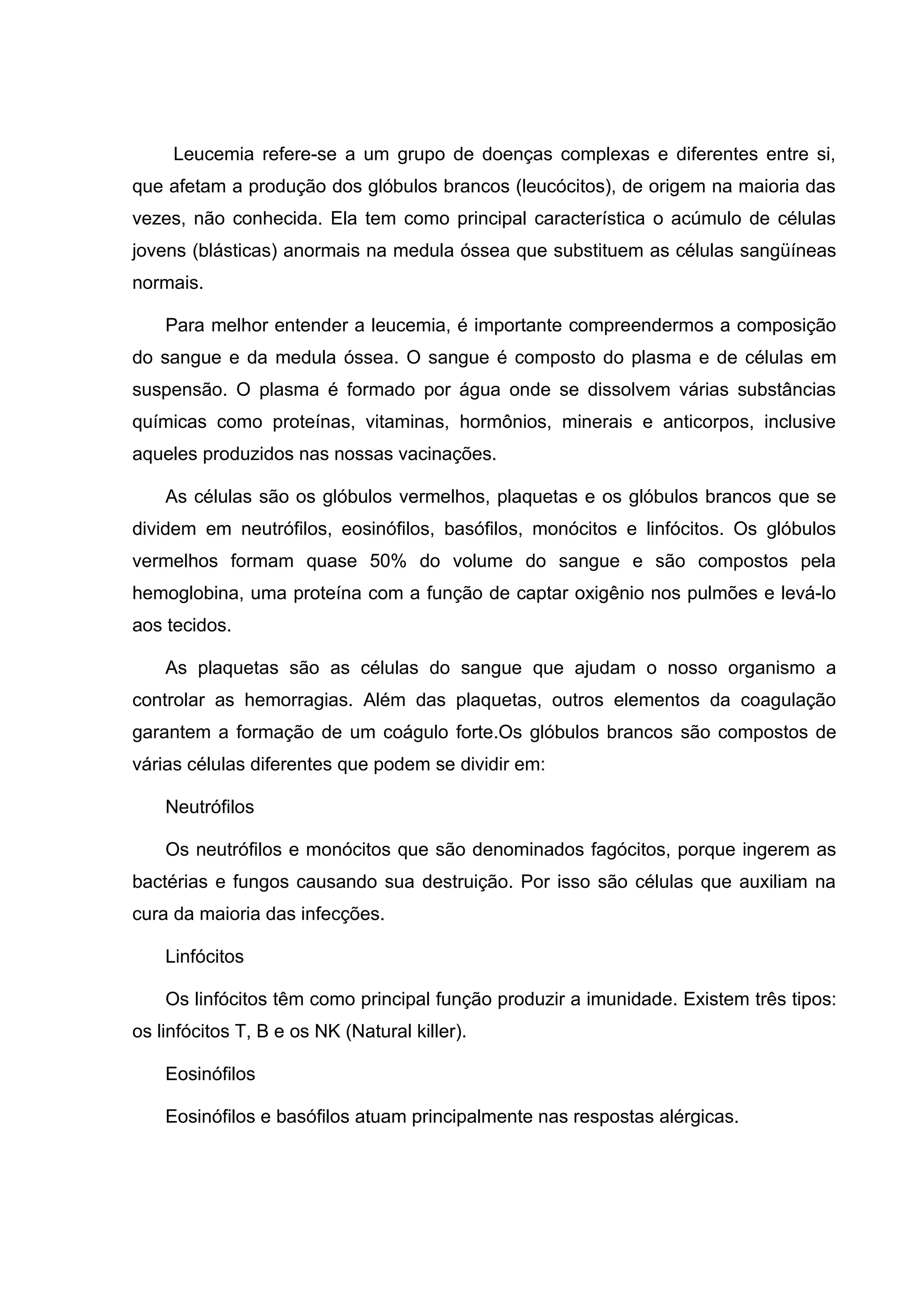 A leucemia refere-se a um grupo de doenças que afetam a produção dos glóbulos brancos na medula óssea, levando ao acúmulo de células imaturas que substituem as células normais. Os principais tipos em crianças são a leucemia linfóide aguda e a leucemia mielóide aguda, que causam sintomas como febre, sangramentos e fadiga devido à falta de células normais no sangue. O diagnóstico e tratamento envolvem exames da medula óssea