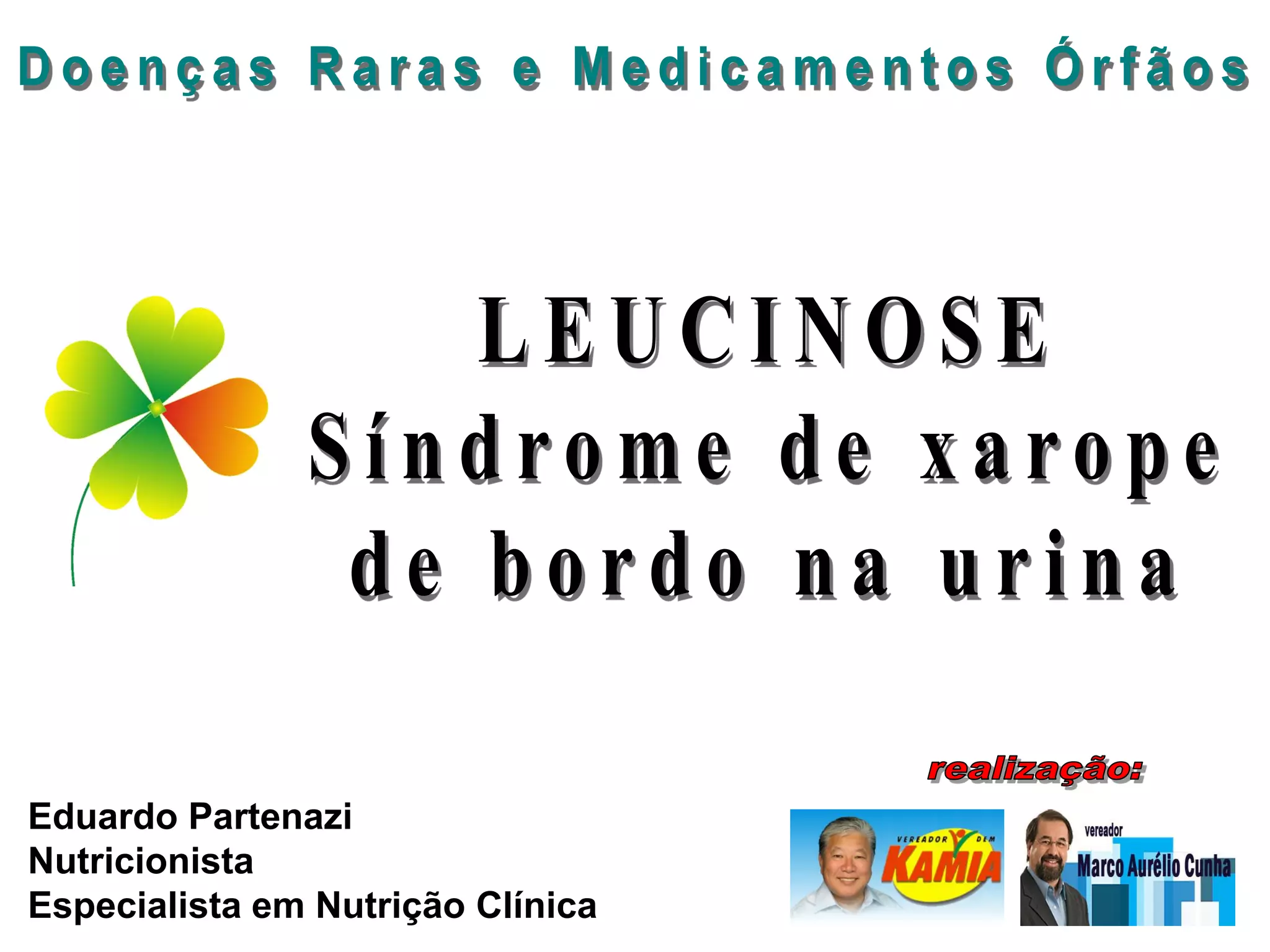 A Leucinose é uma doença hereditária rara causada por uma deficiência enzimática que causa acúmulo de aminoácidos de cadeia ramificada, levando a problemas neurológicos, hipotonia, retardo mental e risco de danos cerebrais graves. Os sintomas incluem letargia, perda de peso e cheiro característico na urina. O diagnóstico é feito por testes de sangue e o tratamento envolve dieta restrita destes aminoácidos.