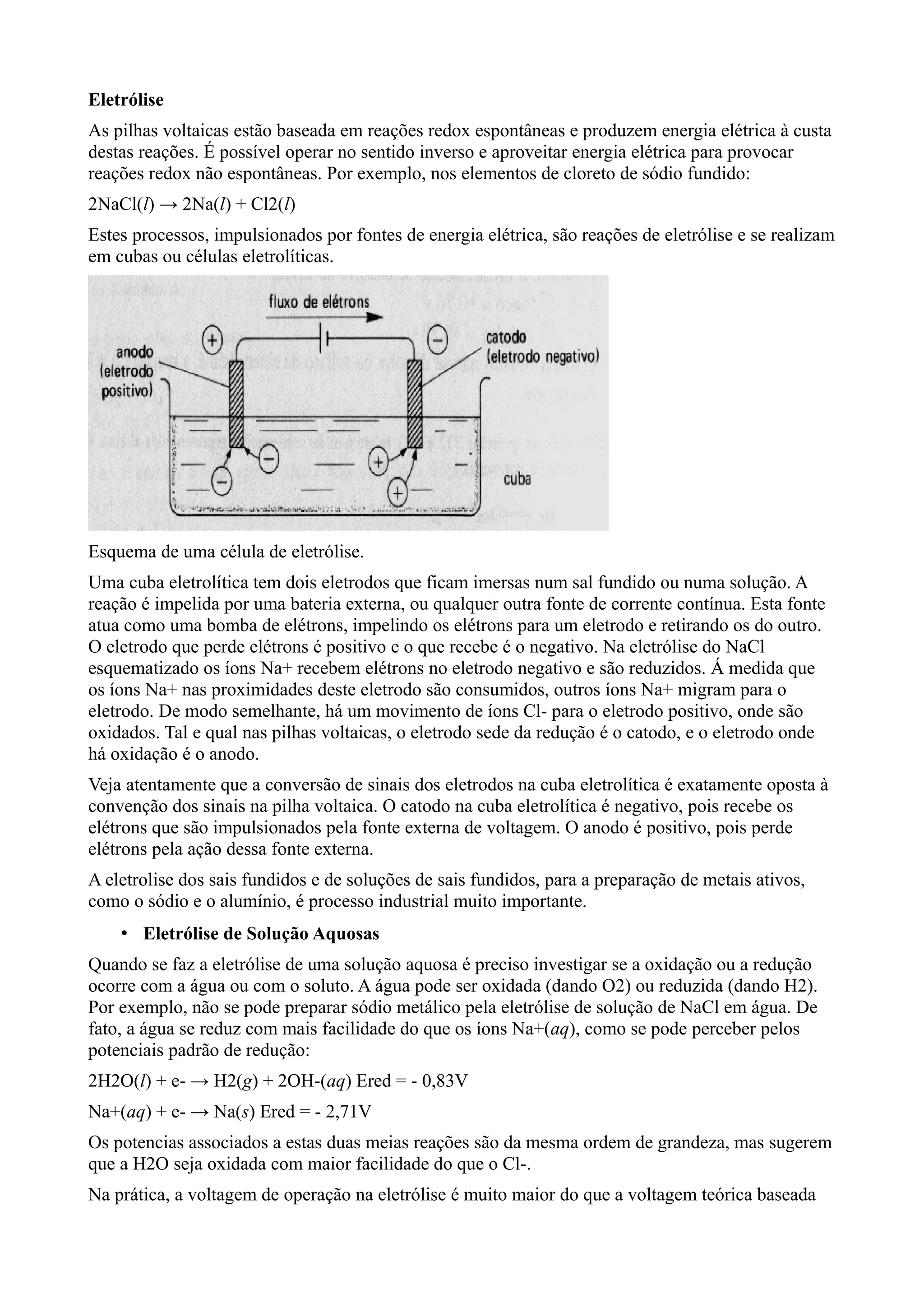 O documento discute eletrólise, o processo de usar energia elétrica para causar reações químicas não espontâneas. Descreve como as células eletrolíticas funcionam usando eletrodos e uma fonte de corrente contínua para impulsionar os elétrons e causar reações redox. Também discute aspectos como polarização, cálculos de carga elétrica e aplicações industriais importantes como a produção de metais.