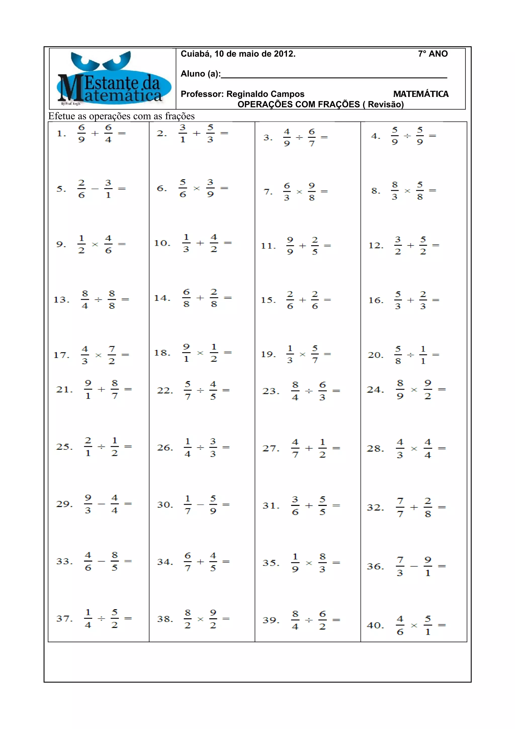 Este documento é uma prova de matemática do 7° ano sobre operações com frações. A prova contém exercícios de adição, subtração, multiplicação e divisão com frações para os alunos praticarem a revisão do assunto.