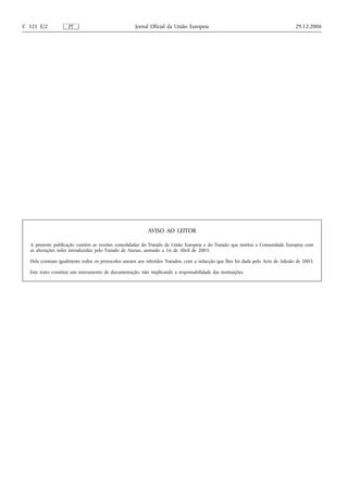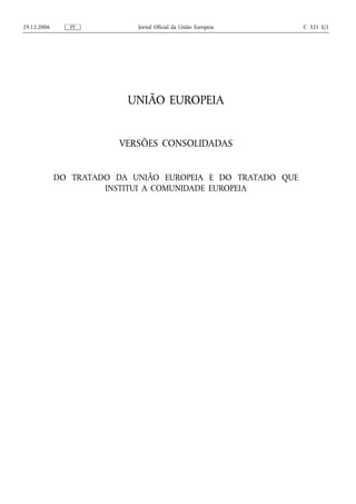 Este documento apresenta as versões consolidadas do Tratado da União Europeia e do Tratado que institui a Comunidade Europeia, com as alterações introduzidas pelo Tratado de Atenas de 2003. Inclui também os protocolos anexos aos tratados com a redação resultante do Acto de Adesão de 2003. Fornece um instrumento de documentação sem implicar responsabilidade das instituições.