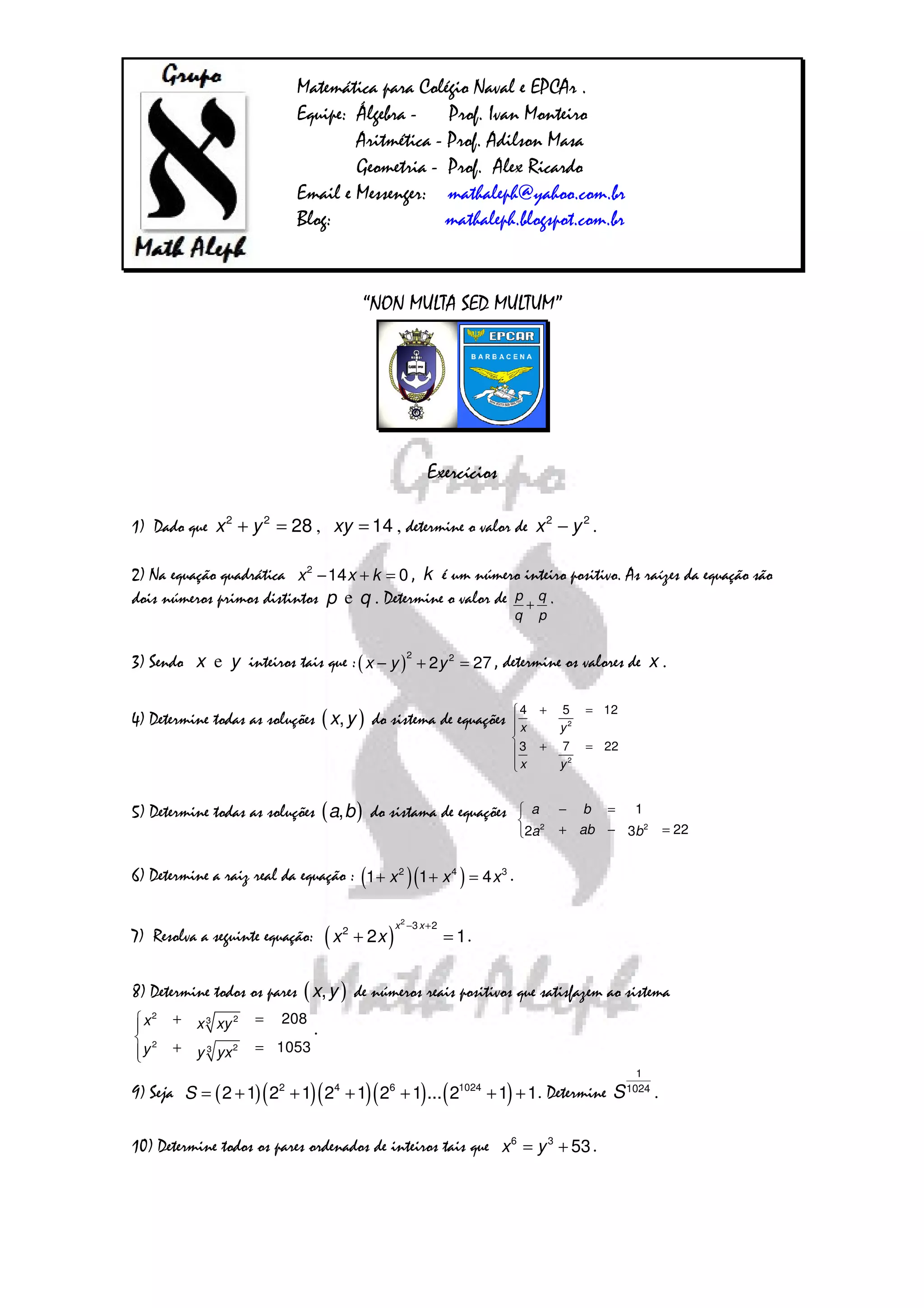 O documento apresenta um grupo de professores de matemática de um colégio naval e suas credenciais de contato. Ele também fornece 10 exercícios de álgebra e geometria para serem resolvidos.