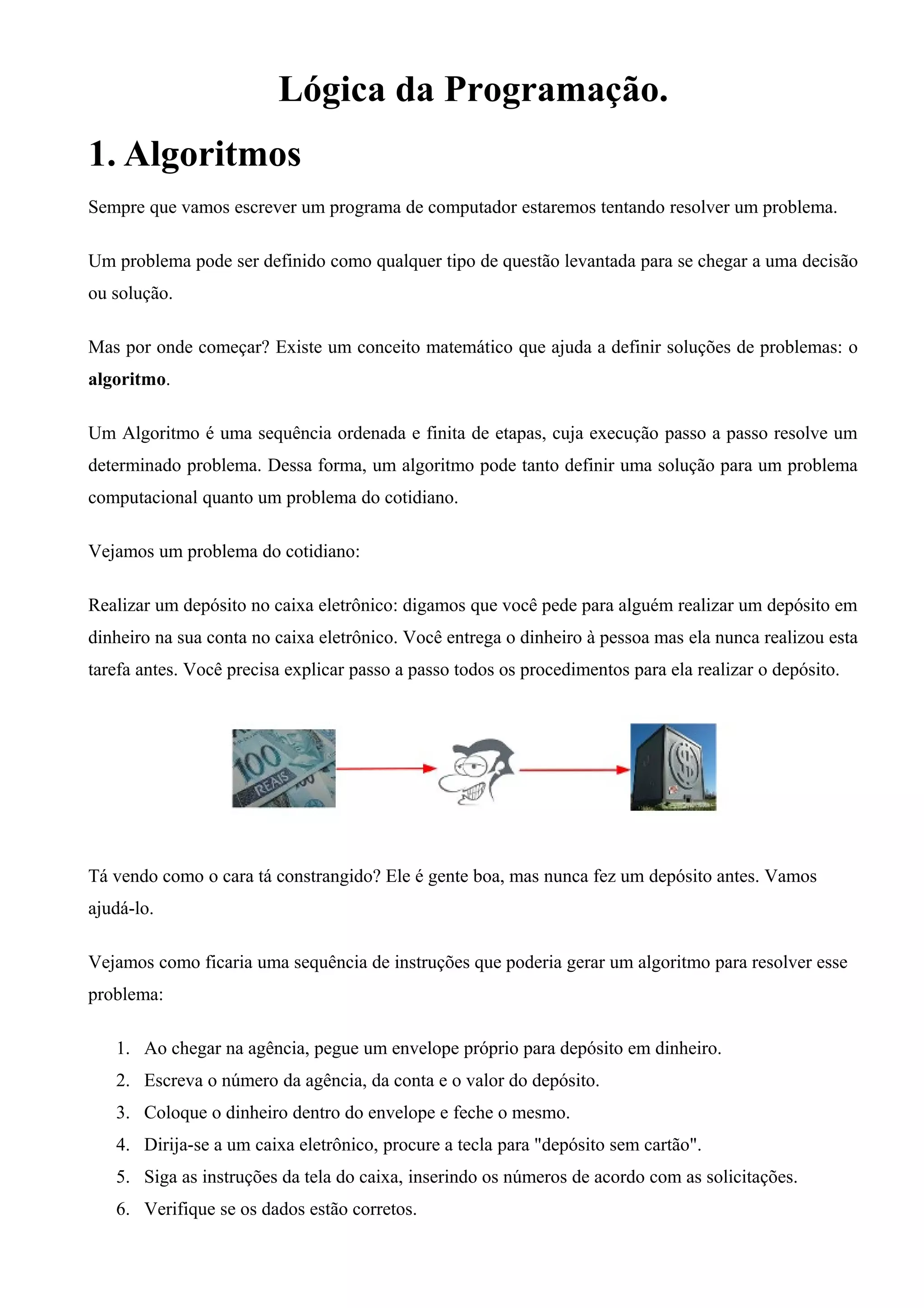 1. O documento discute algoritmos, lógica da programação e português estruturado.