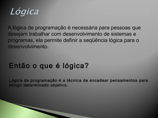 Lógica de programação é necessária para desenvolvimento de sistemas e programas, permitindo definir a sequência lógica para o desenvolvimento. Instruções são um conjunto de regras que indicam ações elementares a um computador executar em ordem sequencial lógica. Algoritmos são sequências finitas de passos claros e precisos que levam à execução de uma tarefa.