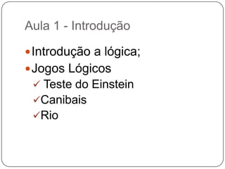 O documento descreve uma série de aulas sobre lógica de programação. A primeira aula apresenta introduções e jogos lógicos. A segunda aula define algoritmos e apresenta exemplos. As aulas subsequentes discutem estruturas de algoritmos, variáveis, operadores, estruturas de decisão e repetição.
