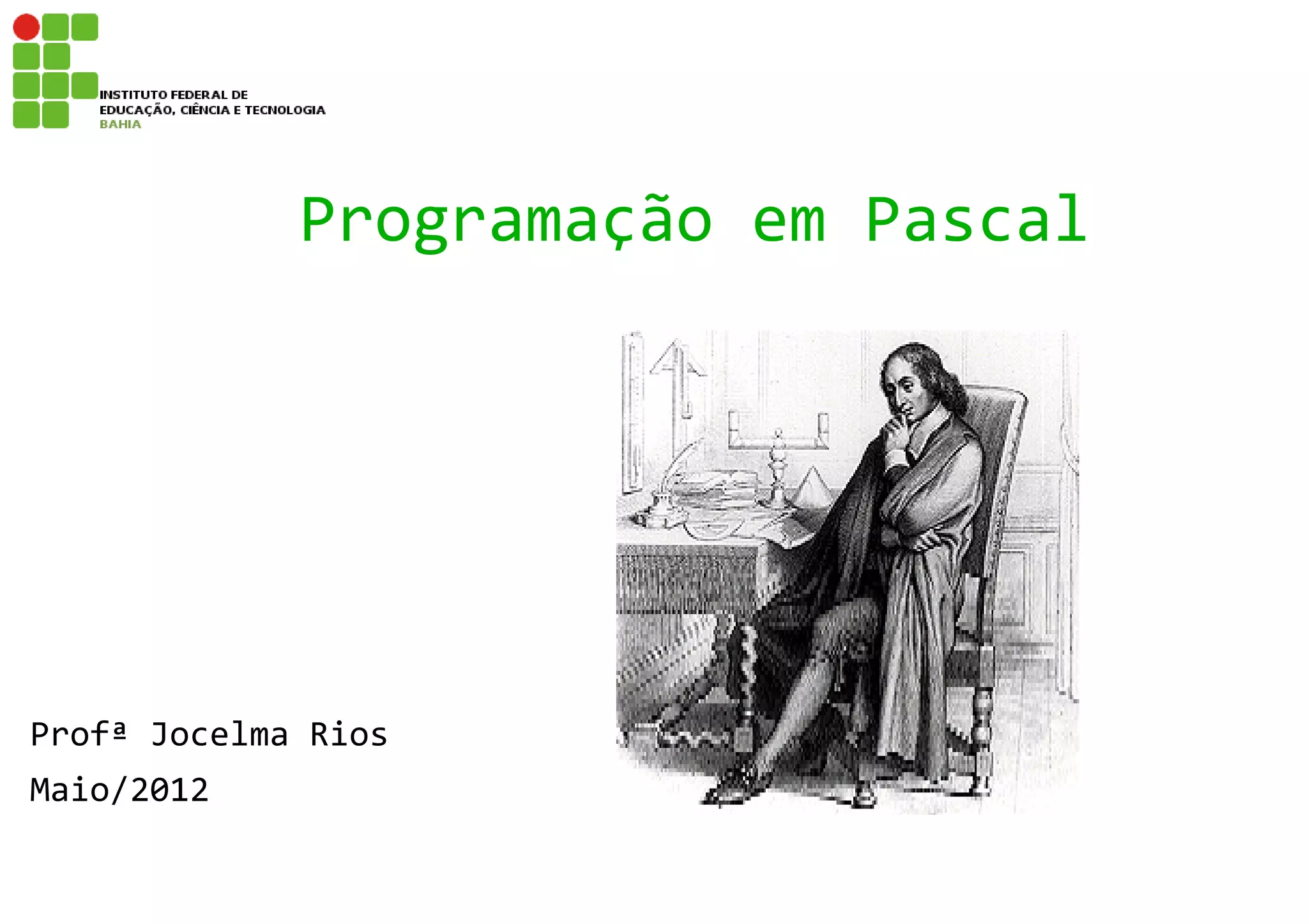O documento descreve uma linguagem de programação chamada Pascal. O Pascal foi criado em 1971 por Niklaus Wirth para promover o uso de código estruturado. O Pascal foi muito popular na década de 1980 e é frequentemente usado para ensinar conceitos básicos de programação. O documento explica elementos-chave do Pascal como variáveis, constantes, operadores, estruturas de decisão e repetição.