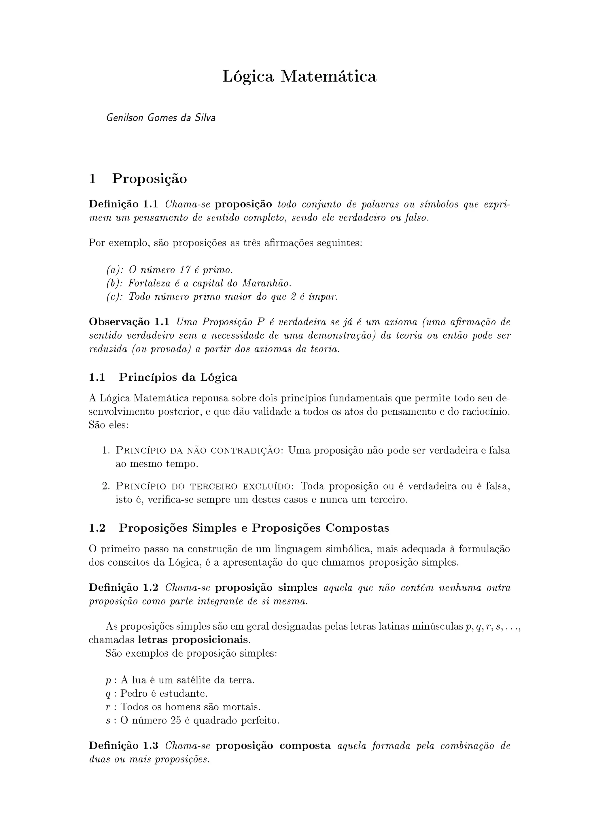 O documento apresenta os conceitos básicos da lógica matemática, incluindo: 1) Definições de proposição, proposição simples e composta; 2) Conectivos lógicos como negação, conjunção, disjunção e implicação; 3) Tabelas-verdade para representar os valores lógicos de proposições; 4) Conceitos de tautologia, contradição e implicação lógica.