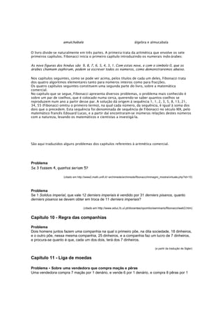 O livro Liber Abaci, escrito por Fibonacci em 1202, introduziu os numerais indo-arábes na Europa e continha problemas matemáticos úteis para mercadores. Dividido em 15 capítulos, tratava de aritmética, álgebra, proporções e resolução de problemas diversos usando métodos como a falsa posição. Sua influência ajudou a difundir o sistema numérico indo-arárabe e métodos matemáticos avançados na época.