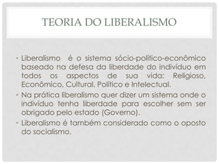 O documento descreve o liberalismo inglês, com ênfase nos principais pensadores como Adam Smith, John Locke, Jeremy Bentham e John Stuart Mill. O liberalismo defende a liberdade individual em oposição ao socialismo, e o liberalismo inglês do século XIX surgiu no auge do Império Britânico e da Revolução Industrial.