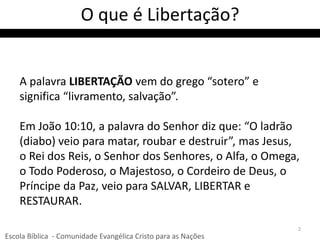 O documento discute a libertação cristã, explicando que Jesus veio para salvar, libertar e restaurar. A libertação ocorre nas esferas do espírito, alma e corpo, e envolve libertar-se de pecados, curar feridas e expulsar demônios. A verdade conhecida em Cristo é que traz verdadeira liberdade.