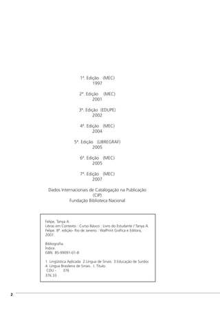 Este documento descreve a 8a edição do livro "Libras em Contexto: Curso Básico - Livro do Estudante". Ele fornece informações sobre as edições anteriores do livro, seus autores, colaboradores e parceiros na publicação. O texto também destaca a importância do livro para o ensino da Língua Brasileira de Sinais e a oficialização desta língua no Brasil.