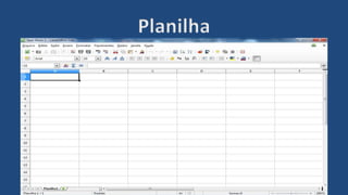 O documento descreve diferentes formatos de arquivos para planilhas eletrônicas, incluindo .ods, .xls e .xlsx. Também menciona funções como SOMA e MÉDIA usadas em cálculos em planilhas do LibreOffice Calc.
