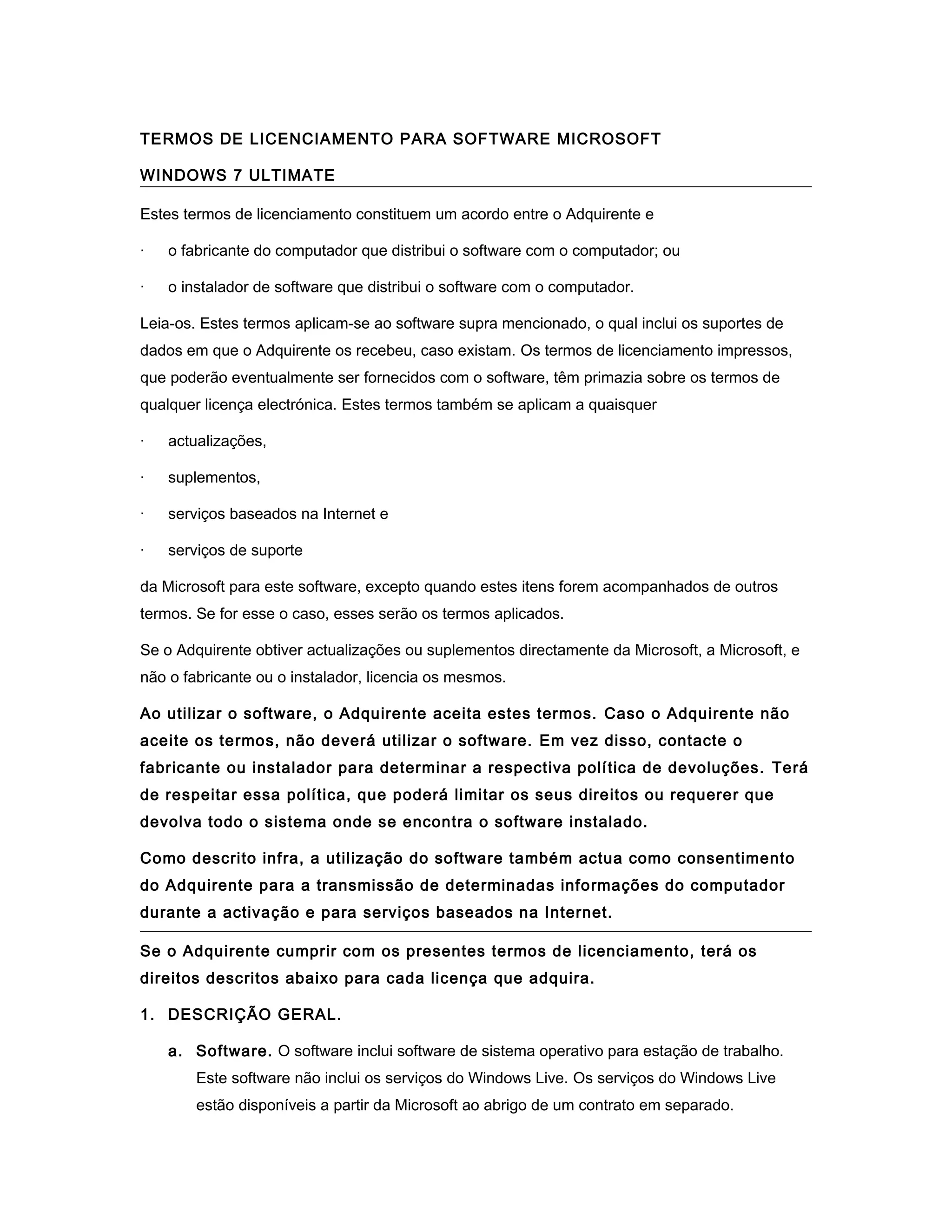 Este documento descreve os termos de licenciamento do software Windows 7 Ultimate. Ele concede ao usuário uma licença permanente para usar o software em um computador. O usuário deve ativar o software dentro de um período de tempo e pode estar sujeito a verificações periódicas para garantir o cumprimento dos termos da licença.