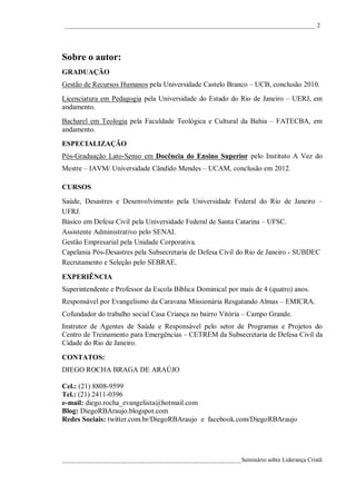 O documento discute conceitos de liderança cristã, incluindo estilos de liderança, princípios de liderança segundo a Bíblia, requisitos para ser um bom líder, a liderança de Jesus e a escala de valores do líder cristão.