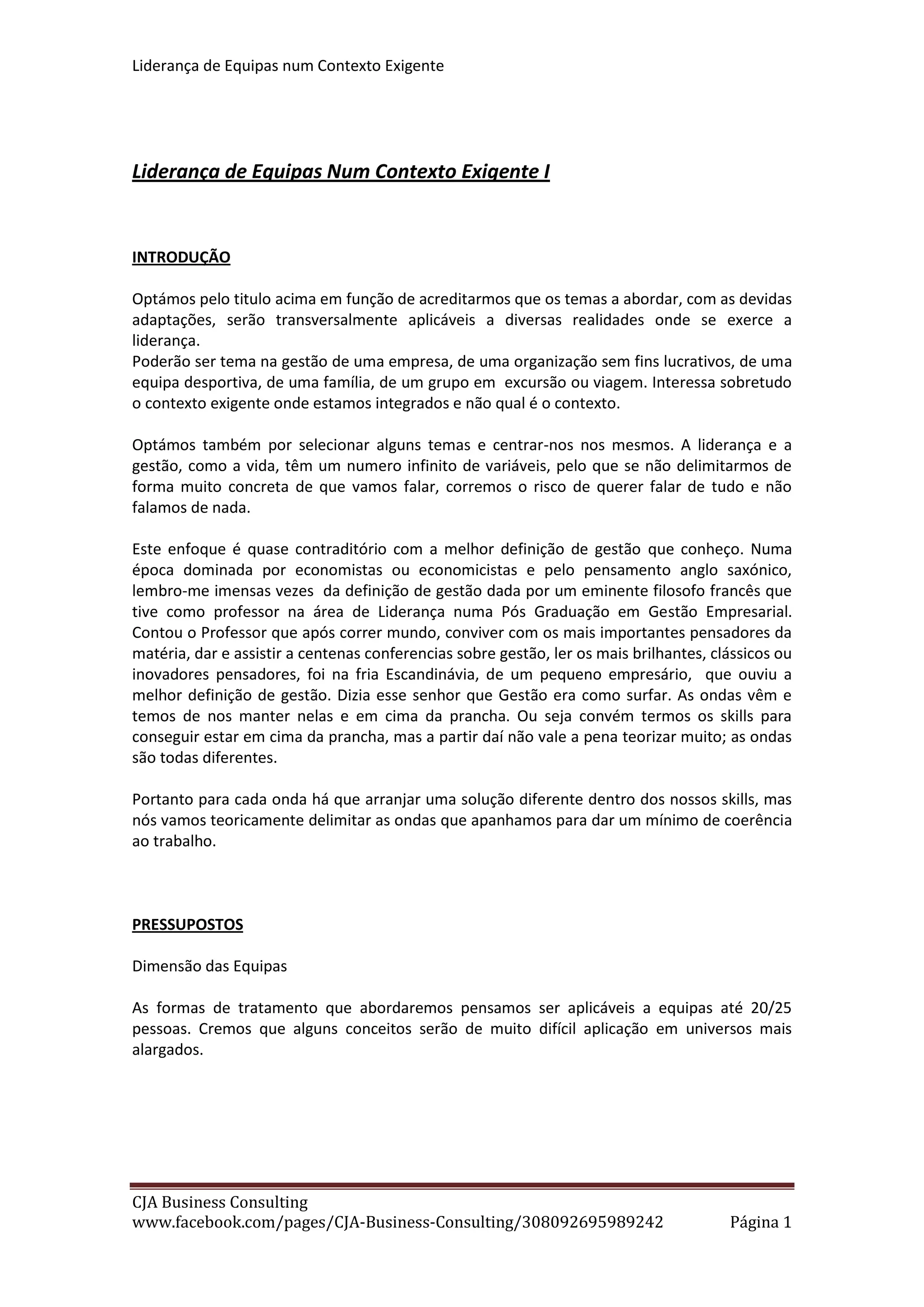 Este documento discute princípios de liderança de equipes em contextos exigentes. Aborda a importância de estabelecer objetivos claros para a equipe, incluindo objetivos de curto e longo prazo. Também discute a necessidade de respeitar as características individuais dos membros da equipe e promover a solidariedade dentro da equipe e com os stakeholders externos.