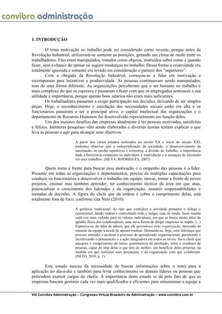 Este documento discute a liderança e motivação nas organizações. Apresenta definições de liderança e estilos de liderança, e discute a importância do líder em motivar os funcionários. Também aborda teorias sobre motivação no trabalho e fatores que podem motivar os empregados. Conclui que embora os líderes ajudem na motivação, a vontade de se desenvolver vem de cada indivíduo.