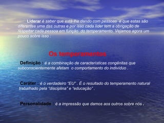 1) O documento discute os diferentes temperamentos humanos (sanguíneo, colérico, melancólico e fleumático) e suas características.