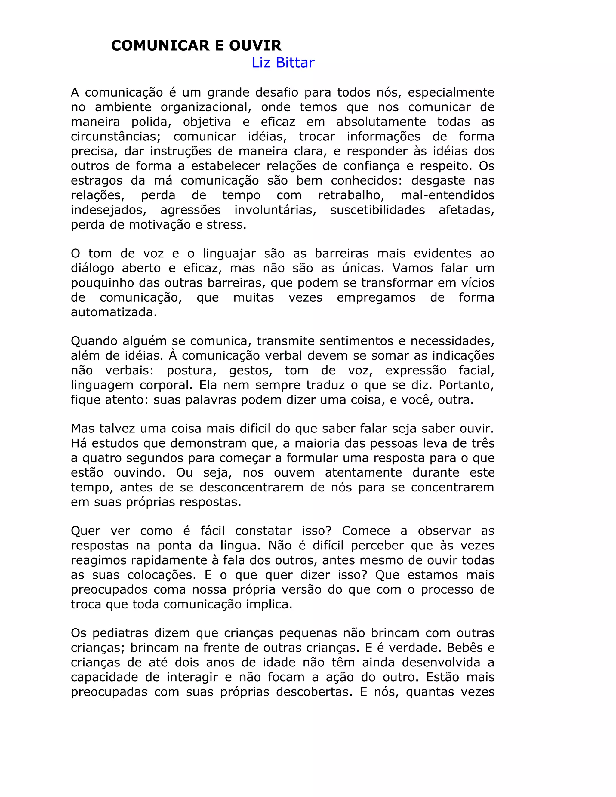 (1) A comunicação é um desafio, especialmente no ambiente de trabalho, onde é necessário se comunicar de forma educada, objetiva e eficaz em todas as situações; (2) As barreiras à comunicação eficaz incluem o tom de voz, linguagem e a tendência de focar mais em formular nossa própria resposta do que ouvir atentamente; (3) A habilidade de ouvir com atenção é fundamental para entender as intenções do outro e encontrar consenso, mesmo quando se discorda.