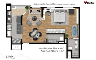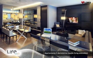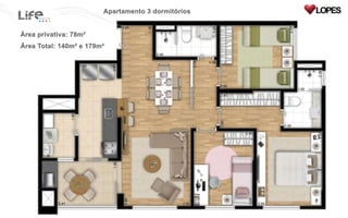 O documento lista 3 tipos de apartamentos com diferentes números de dormitórios e tamanhos variando de 58 a 78 metros quadrados.