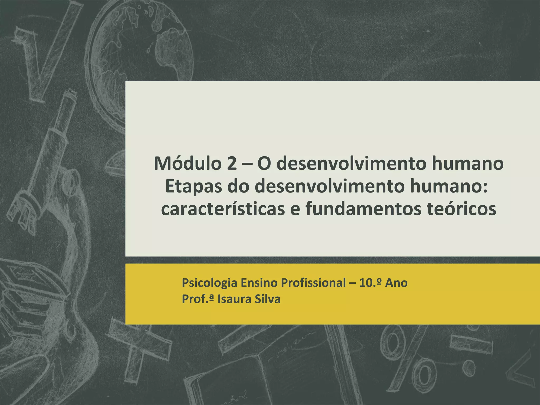 O documento descreve a teoria do desenvolvimento cognitivo de Jean Piaget, incluindo os conceitos de assimilação, acomodação e equilíbrio. A teoria define quatro estádios de desenvolvimento - sensoriomotor, pré-operatório, operações concretas e operações formais - cada um com características cognitivas específicas. O desenvolvimento ocorre através da interação entre o indivíduo e o meio.