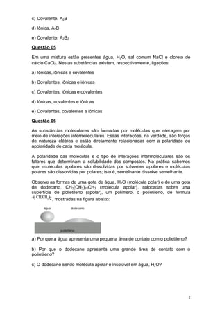 O documento contém 15 questões sobre ligação química. As questões abordam tópicos como tipos de ligação, polaridade, geometria molecular, solubilidade e pontos de fusão e ebulição de compostos químicos. Há também perguntas sobre configuração eletrônica de elementos da tabela periódica.