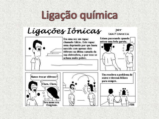 O documento explica como os átomos se ligam através de ligações químicas para formar moléculas. Descreve dois tipos principais de ligações: ligações covalentes, onde átomos compartilham elétrons, e ligações iônicas, onde átomos transferem elétrons. Também discute como os metais se ligam através de uma "mar de elétrons".