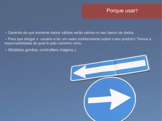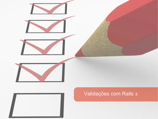 Validações com Rails 3 garantem que somente dados válidos serão salvos no banco de dados, guiando o usuário a fornecer as informações corretas. O documento exemplifica como validar a presença, unicidade e formato de email de um usuário usando validações no modelo.