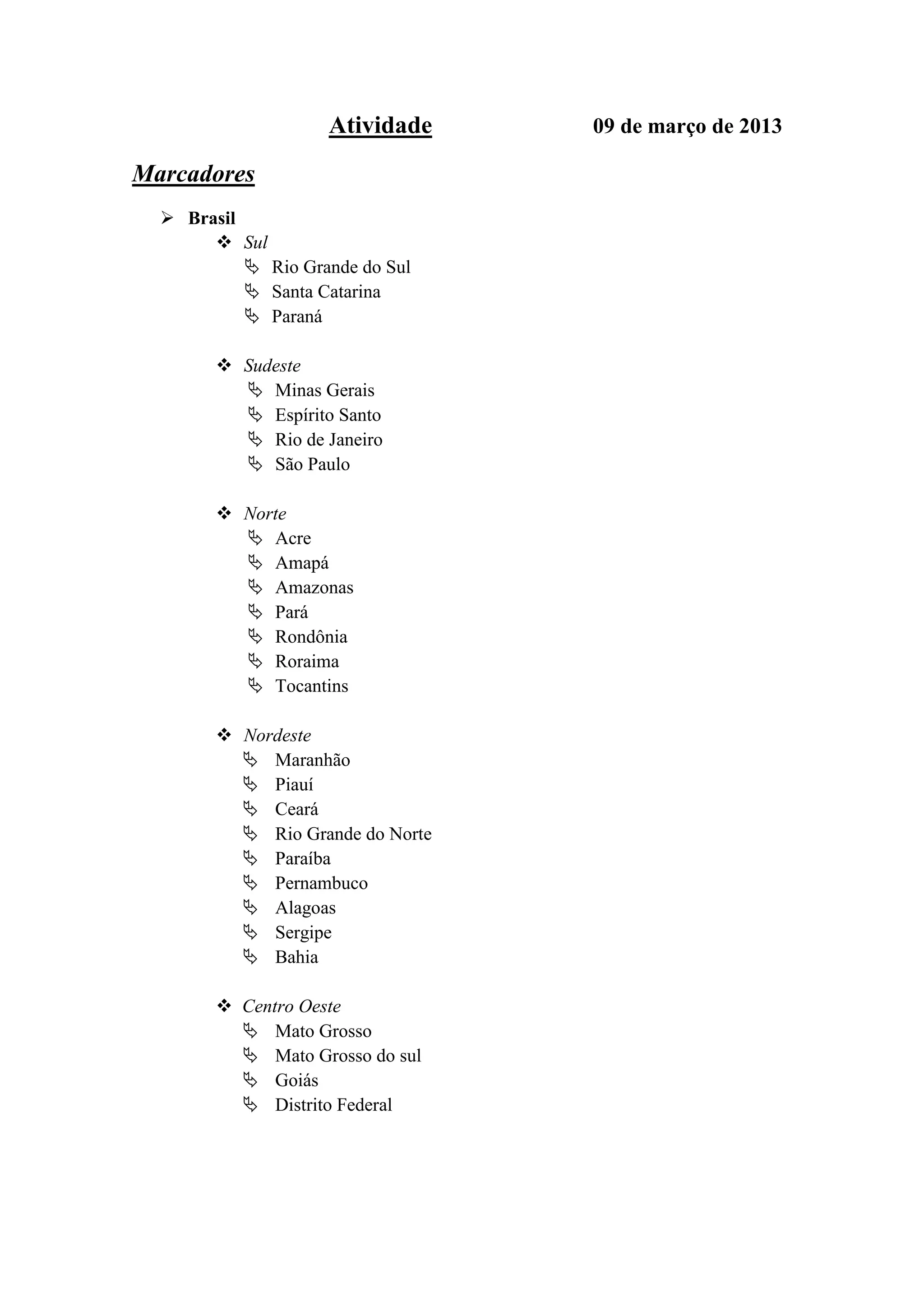 O documento lista as regiões e estados do Brasil, dividindo-os em Sul, Sudeste, Norte, Nordeste e Centro-Oeste, e fornecendo os nomes dos estados em cada região.