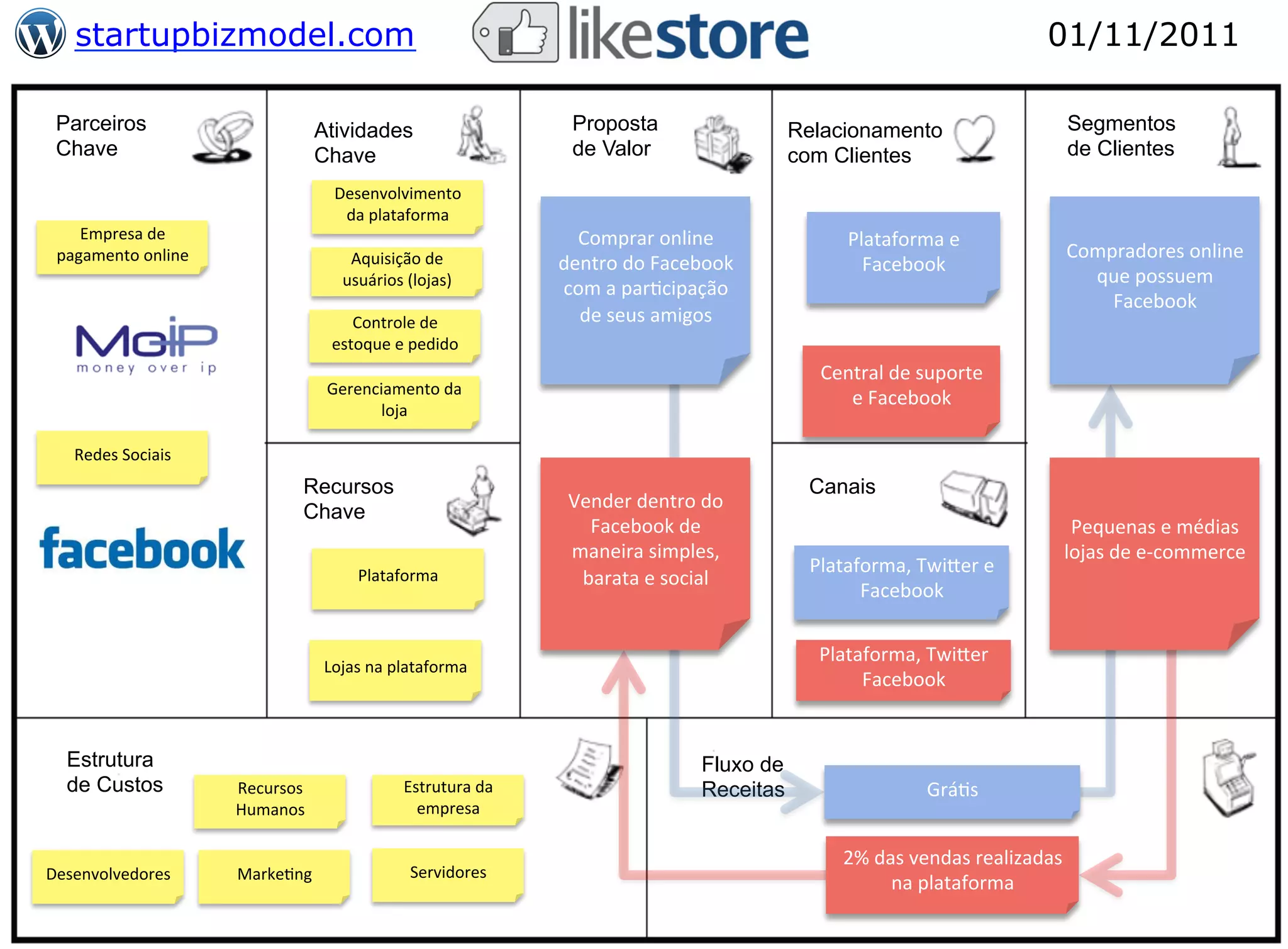 O documento descreve uma proposta de valor de uma startup para vender produtos online dentro do Facebook de maneira simples e social para pequenas lojas. A startup usaria parceiros como empresas de pagamento online e redes sociais para desenvolver uma plataforma que permitiria comprar e vender produtos dentro do Facebook.