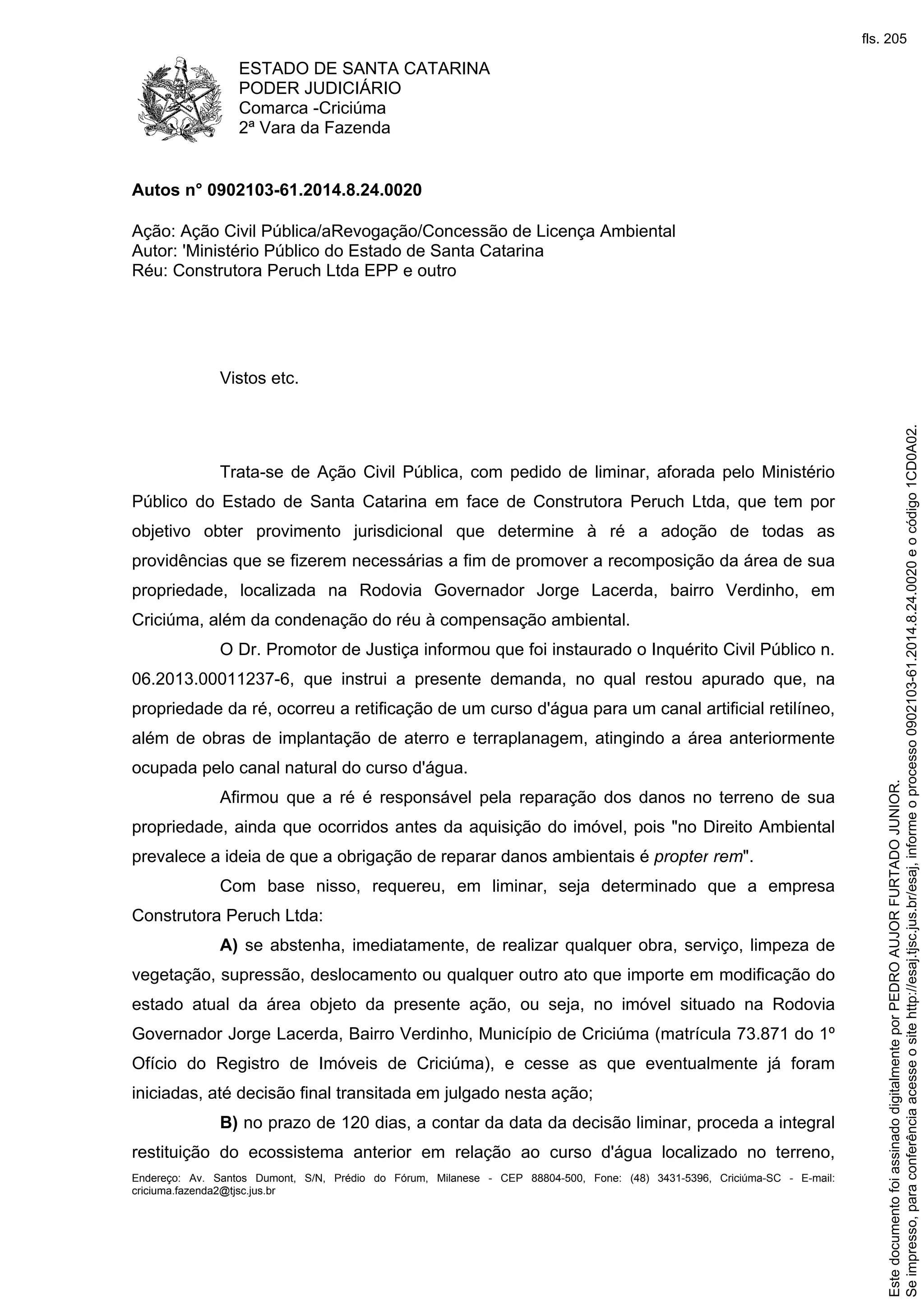 O documento trata de uma Ação Civil Pública movida pelo Ministério Público contra uma construtora por modificações realizadas em um curso d'água em sua propriedade sem as devidas licenças ambientais. O juiz concedeu liminar determinando que a construtora promova a restauração da área degradada e da mata ciliar no prazo de 120 dias, sob pena de multa diária.