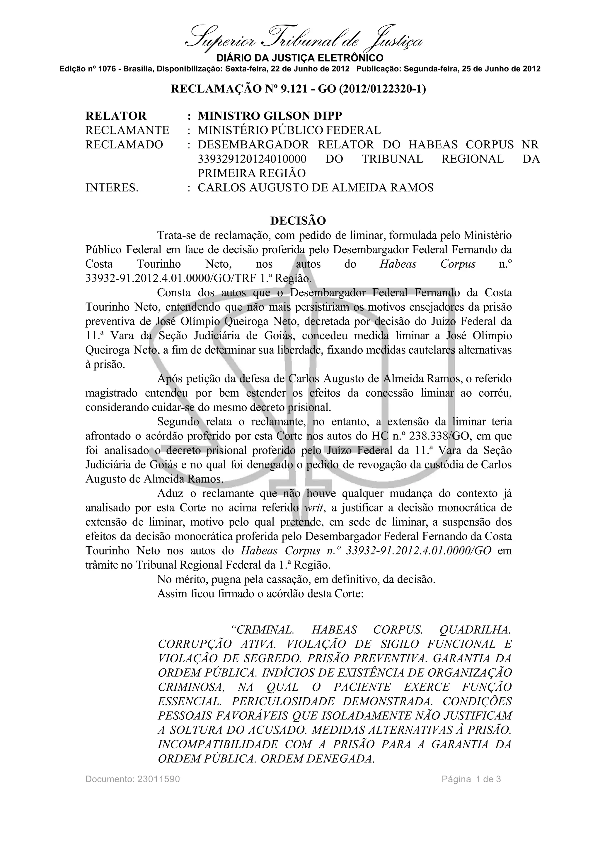 O Ministério Público Federal entrou com uma reclamação contra uma decisão de um desembargador que concedeu liminar para liberdade de um réu. O Superior Tribunal de Justiça concedeu liminar suspendendo os efeitos da decisão do desembargador até o julgamento final da reclamação, uma vez que a decisão do desembargador contrariava um acórdão anterior do próprio STJ sobre o mesmo caso.