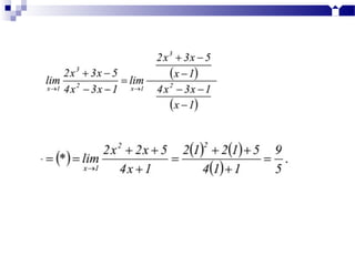1) O documento discute noções intuitivas de limites em funções matemáticas e sucessões numéricas. 2) Apresenta exemplos de cálculo de limites à direita e esquerda graficamente. 3) Discutem definições formais de limites e propriedades dos mesmos.