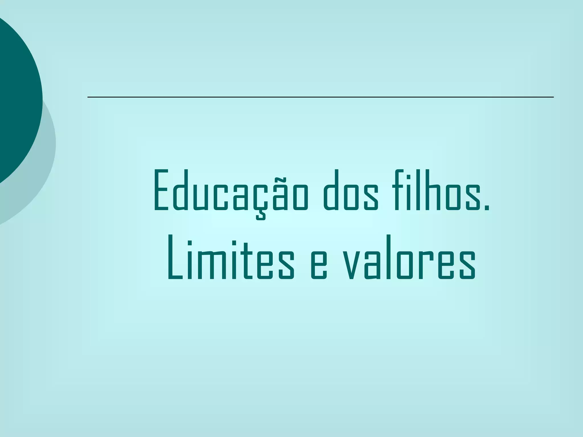 O documento discute a importância de limites e valores na educação dos filhos. Limites ajudam as crianças a se sentirem seguras e aprenderem a respeitar as regras, enquanto valores como amor, solidariedade e ética formam adultos íntegros. Pais devem estabelecer limites com amor e coerência para promover o crescimento das crianças.