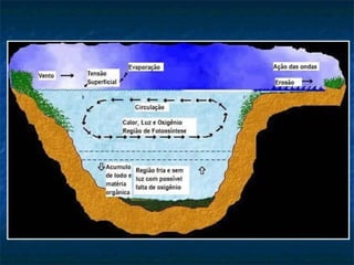 O documento descreve os principais aspectos do limnociclo, o biociclo de água doce, incluindo a divisão em províncias lóticas (rios) e lênticas (lagos e lagoas), as características dessas províncias e zonas dentro de lagos, como a estratificação térmica e disponibilidade de nutrientes, e caracteriza brevemente estuários, pântanos salgados e manguezais.