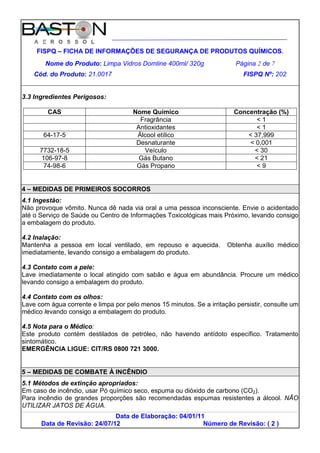 Este documento fornece informações de segurança sobre o produto Limpa Vidros Domline 400ml/320g. Ele resume que o produto é um aerossol inflamável composto principalmente por álcool etílico, veículo e gás propelente butano/propano. Fornece instruções sobre os riscos à saúde e ao meio ambiente associados, bem como medidas de primeiros socorros, combate a incêndios, controle de derramamentos e proteção pessoal durante o manuseio e armazenamento.
