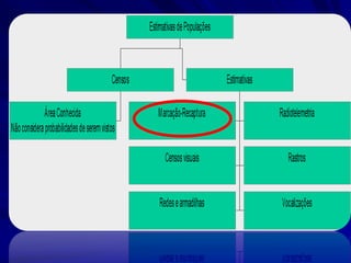 O documento discute técnicas de amostragem populacional, incluindo marcação e recaptura. Este método envolve marcar indivíduos, soltá-los, e depois recapturar para estimar o tamanho total da população baseado na proporção de indivíduos marcados na amostra de recaptura. Vários modelos matemáticos como o índice de Lincoln-Peterson são usados para estas estimativas, requerendo certas premissas como mistura completa e população fechada.