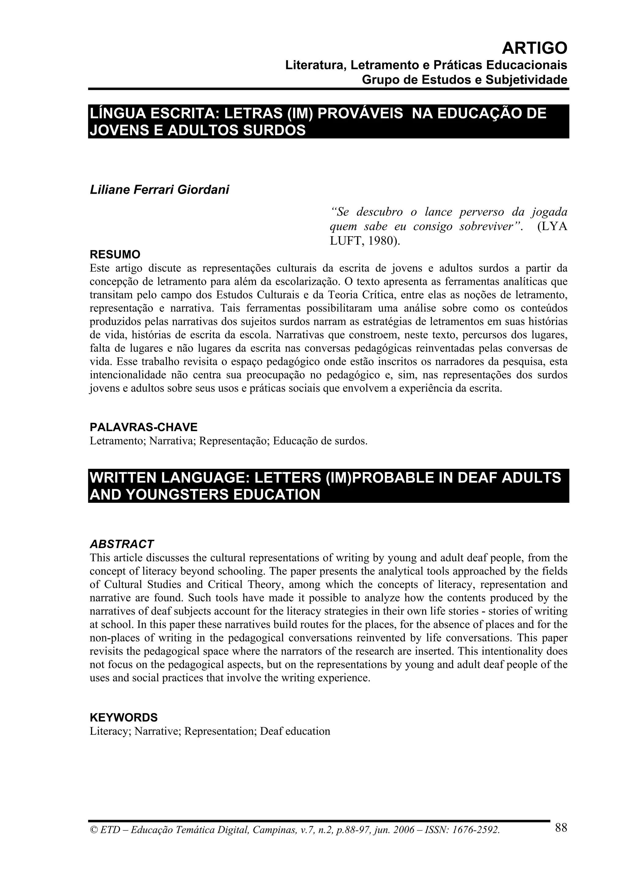 Este artigo discute as representações culturais da escrita de jovens e adultos surdos a partir da concepção de letramento para além da escolarização. Analisa como as narrativas dos surdos constroem percursos de letramentos em suas vidas e como a escola nem sempre reconhece essas práticas. Argumenta que a escrita deve ser compreendida segundo os usos e necessidades de cada grupo social.