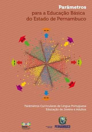 O documento apresenta parâmetros curriculares de língua portuguesa para a educação básica no estado de Pernambuco, dividido em seis eixos. O primeiro eixo trata da apropriação do sistema alfabético, o segundo da análise linguística, o terceiro da oralidade, o quarto da leitura, o quinto da literatura e contextos sócio-históricos e o sexto da escrita. Para cada eixo, há expectativas de aprendizagem para o ensino fundamental e médio da educação de jov