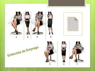 O documento discute a linguagem corporal e fornece dicas para ter uma linguagem corporal expressiva, como esvaziar as mãos, manter as mãos livres e variar os gestos de forma natural. Também discute que o corpo é reflexo das emoções e que transmite informações inconscientes durante a comunicação.