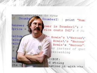 O documento fornece uma visão geral da linguagem Perl, incluindo sua criação, pontos fortes e fracos, semelhanças com outras linguagens e exemplos de código. Ele aborda estruturas de controle como if-else, unless, while, for e foreach, além de operações aritméticas e manipulação de strings. Também discute o funcionamento de subprogramas e rotinas, destacando a flexibilidade na passagem de parâmetros.