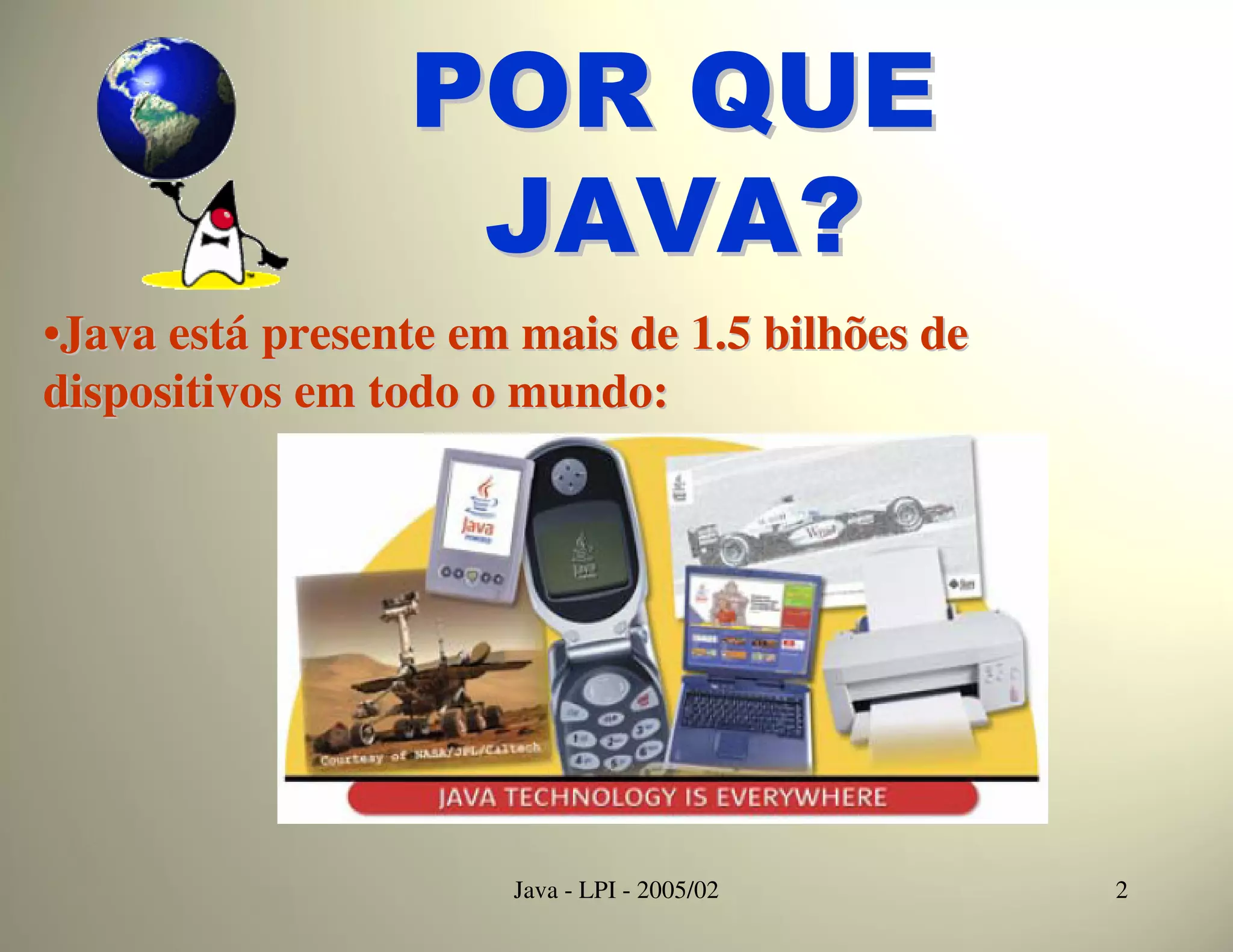 O documento apresenta uma visão geral sobre a linguagem de programação Java, detalhando sua ubiquidade em dispositivos e sua arquitetura de software. Ele cobre a história do Java, características da linguagem, tipos de dados, tratamento de exceções e variáveis, além de operações fundamentais e controle de fluxo. Java é descrito como uma linguagem orientada a objetos, robusta e com foco em plataformas, permitindo a troca entre diferentes dispositivos.