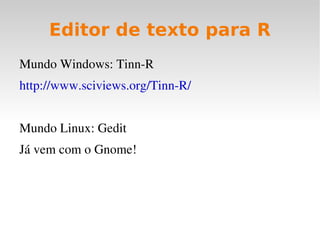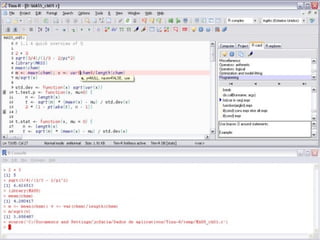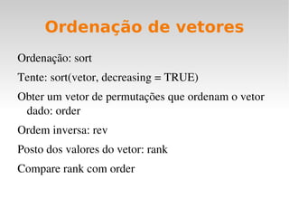 1) O documento introduz a linguagem R, abordando sua história, instalação, editores de texto, manipulação de objetos, entrada e saída de dados, e distribuições de probabilidade.