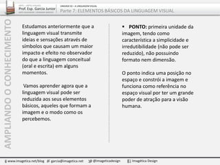 O documento aborda os elementos básicos da linguagem visual, enfatizando a importância de pontos, linhas e formas na construção das imagens. Explora como esses elementos podem ser organizados para transmitir significados e sensações, destacando sua presença na natureza e na arte. Além disso, menciona a relação entre essas formas e as texturas, dimensões e representações tridimensionais em superfícies bidimensionais.